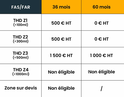- Sur les zones très denses 1 et 2 pour le lien FTTO 2 M sur le réseau Covage. FAS = 1000 € sur la zone très dense 3 sur le réseau Covage.